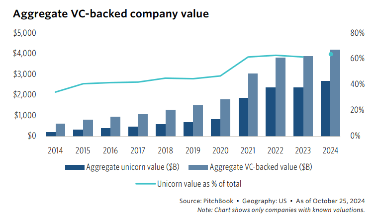 Unicorns account for over 60% of VC NAV. $2.6T of VC book value is attributable to Unicorns: